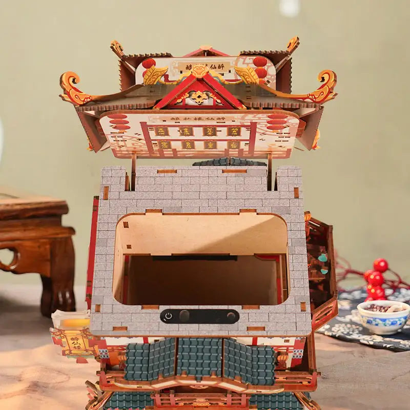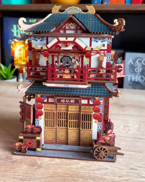 From the front, the design looks like a tiny restaurant frozen at dusk: a signboard above the entrance, warm lanterns at the door, windows, railings and decorative elements that echo classic Chinese style. Once assembled, it feels like you have a little slice of an ancient food street parked next to your keyboard, adding story and character to your workspace instead of another plain pen holder. The compact footprint makes it easy to fit on a desk, bedside table or bookshelf, while the vertical structure creates enough presence to stand out among your other décor.