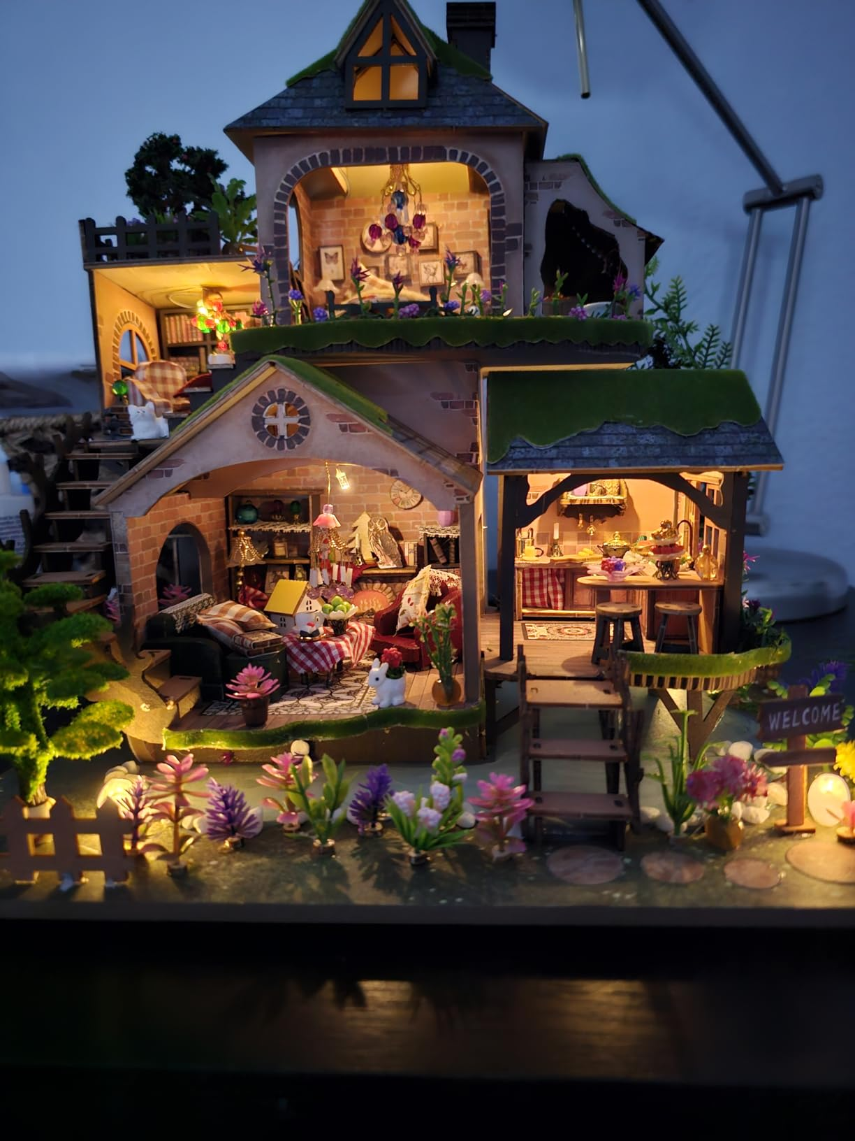 This kit is part of a special desktop storage series that goes beyond a simple dollhouse. Under the roof you will find hidden storage space for small items like jewelry, candy, notes or cards, so your miniature is actually useful day to day. The lid uses an automatic sensing mechanism similar to other desktop storage kits in the line: a gentle wave of your hand can trigger the lid to open and close after a few seconds, while the lanterns light up to create a warm nighttime atmosphere around the restaurant.