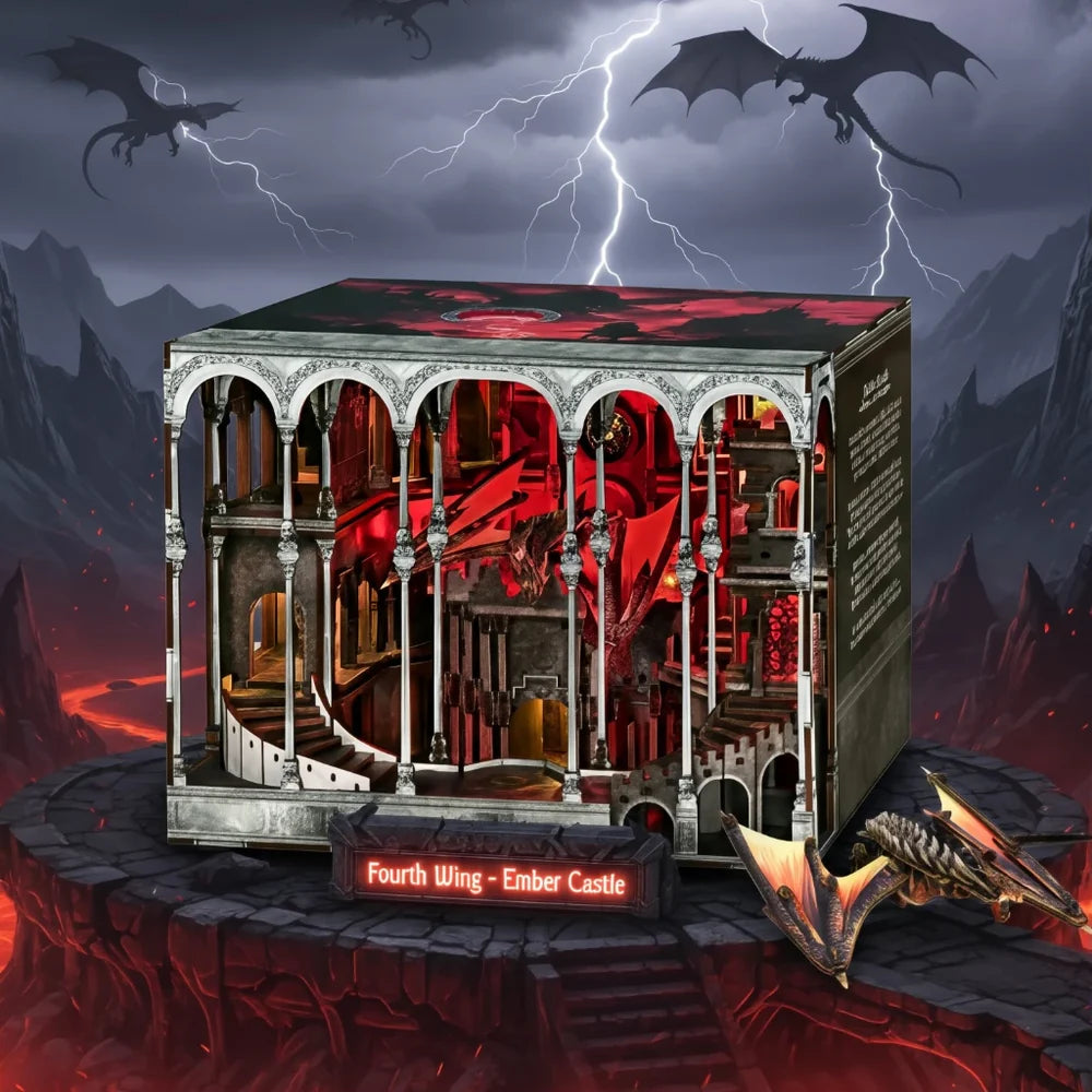 Ember Castle feels like a cinematic moment frozen in time. Towers, gates, and dramatic castle detailing create a powerful silhouette that looks like it belongs to a world where dragons rule the sky and every decision carries weight. The layered depth gives the illusion of a much larger space beyond the frame, so once it is placed between your books, it reads like a portal into an epic academy of fire and fate. It is the perfect centerpiece for fantasy shelves, especially for readers who want their décor to echo the intensity of the stories they love.