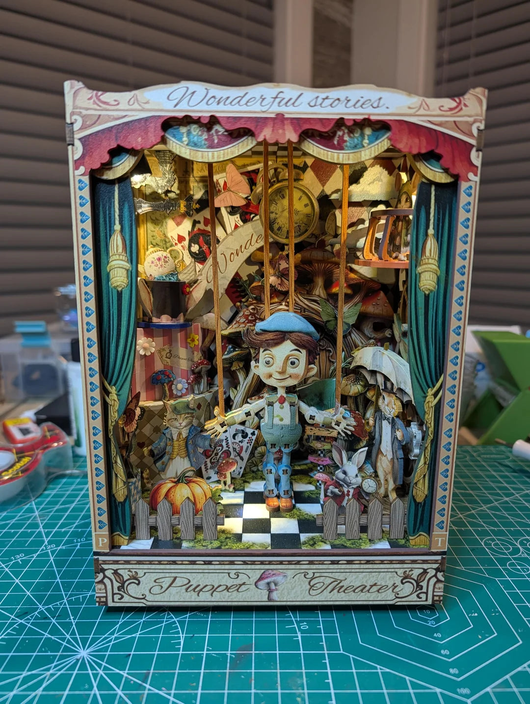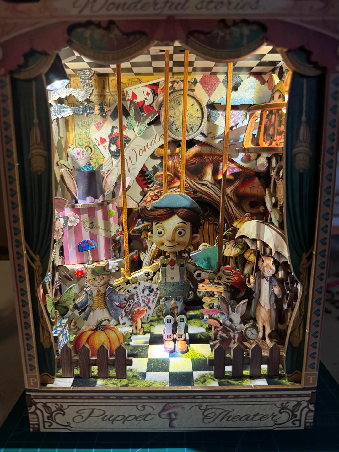 This scene is full of story. The puppet, a mischievous cat and a rabbit guide appear among oversized mushrooms and a towering “obstacle cake” that blocks the path westward, while reversed clocks and curious props hint that time and gravity do not behave normally here. The whole nook is inspired by classic puppet tales and magical adventures, so when you slide it between your books it feels like a moving theater frozen mid scene, inviting you to imagine what happens before and after this moment.