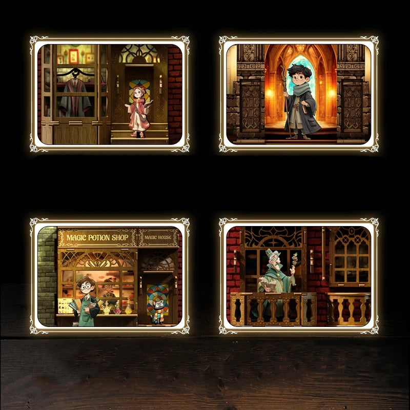 The scene is designed as a narrow, bustling alleyway: tiny shop windows, potion shelves, doorways and hanging signs draw your eye deeper into the miniature town. Lanterns and window frames add height, while little details like bottles, books and crates make it feel like business is still going on after dark. Tucked between your novels, it looks like the sort of place where owls deliver mail, wands are chosen and mysterious ingredients wait behind frosted glass, turning an ordinary shelf into a slice of fantasy.