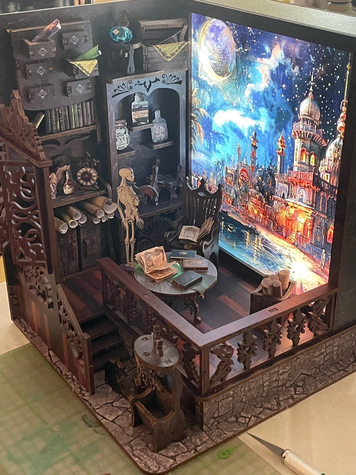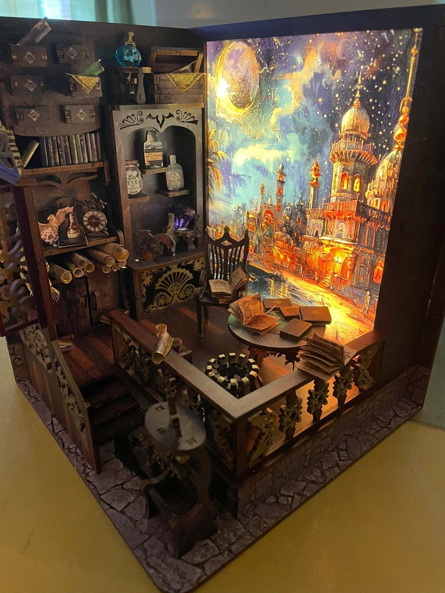 Pre cut wooden parts, numbered pieces, LED components and a clear, illustrated manual guide you step by step through roughly 4 to 8 hours of crafting. Once assembled, movable furniture and a small platform let you adjust the scene or even pose a tiny figure inside, while the included dust cover keeps the tower protected and display ready long term. You only need to add glue and three AAA batteries to bring the lights to life and watch the witch’s tower shimmer in your reading corner. It is an ideal choice for builders who enjoy a bit of challenge and want a dramatic, story rich centerpiece for their fantasy shelf.
