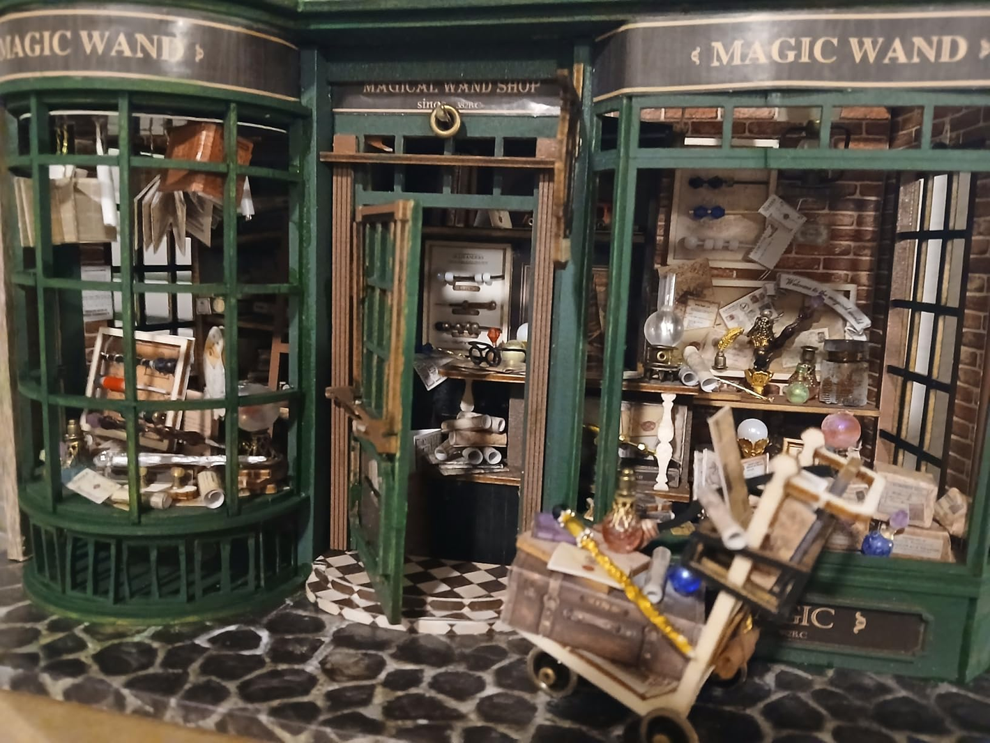 Every brick wall, wooden beam, and painted sign is lovingly detailed to evoke the charm of an old-world magic shop. Intricate shelving holds tiny potion bottles and spell tomes, while the warm glow of faux lanterns brings each nook to life.
