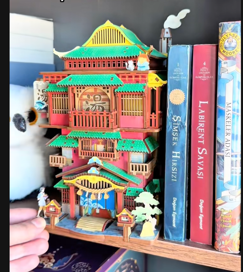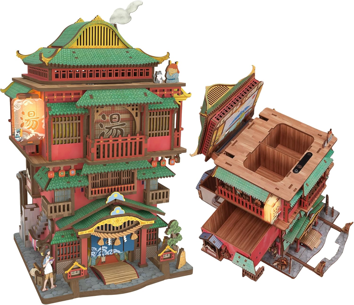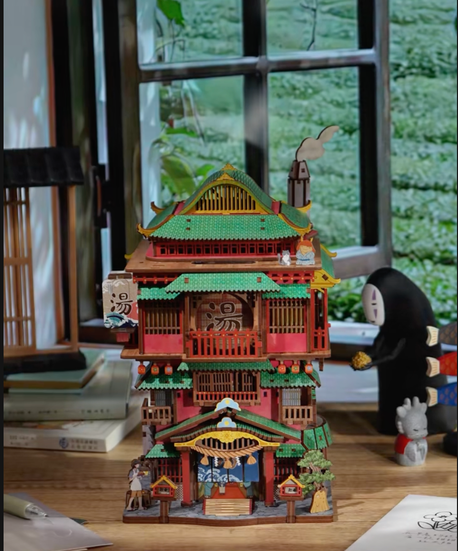 From the moment you begin slotting the wood-cut panels, the bathhouse takes shape: stone-like arches, paper lanterns, tatami mats and a scroll hanging above the hot spring entrance. It’s more than wood—it’s ambiance, inviting you into a world of steam and quiet reflection.