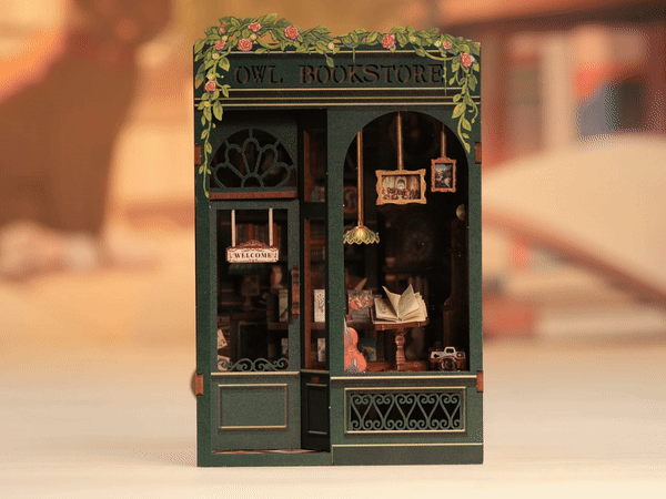 Open the miniature bookstore door and step back in time—dark wooden bookshelves, glowing table lamps, and famous art prints recreate the ambiance of a Renaissance-era English bookshop. Every element exudes charm, history, and literary magic.
