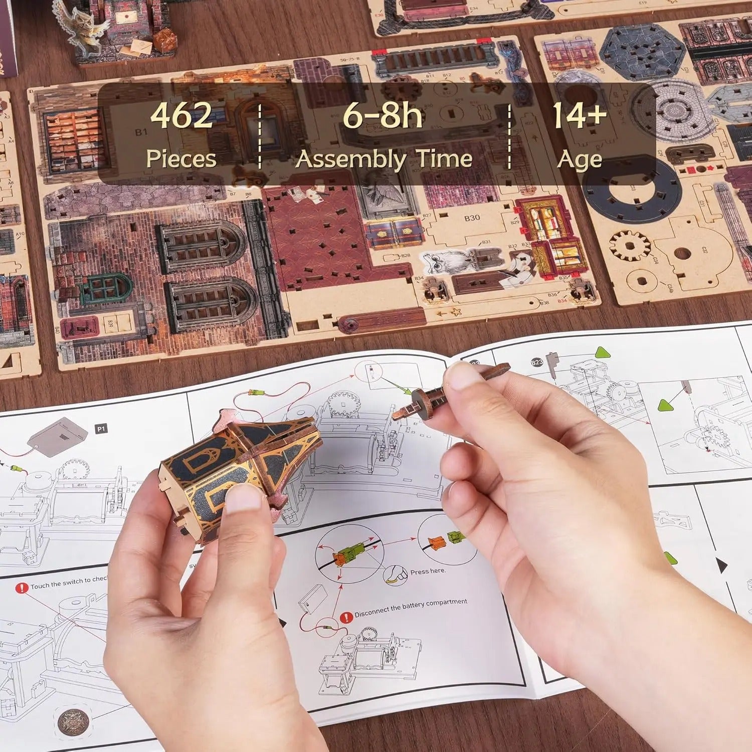 Beyond the visuals, this kit includes charming mechanical features. The centerpiece owl’s wings flap via a simple mechanism, and a functional conveyor and gear setup helps simulate the magical mail process. A built in music movement adds another layer of atmosphere, turning the finished model into a small interactive world. The hidden touch switch controls the lighting, letting you bring the nocturnal scene to life with one tap. The product page also notes a snap fit style build designed to reduce mess and keep assembly smooth, even for many beginners.