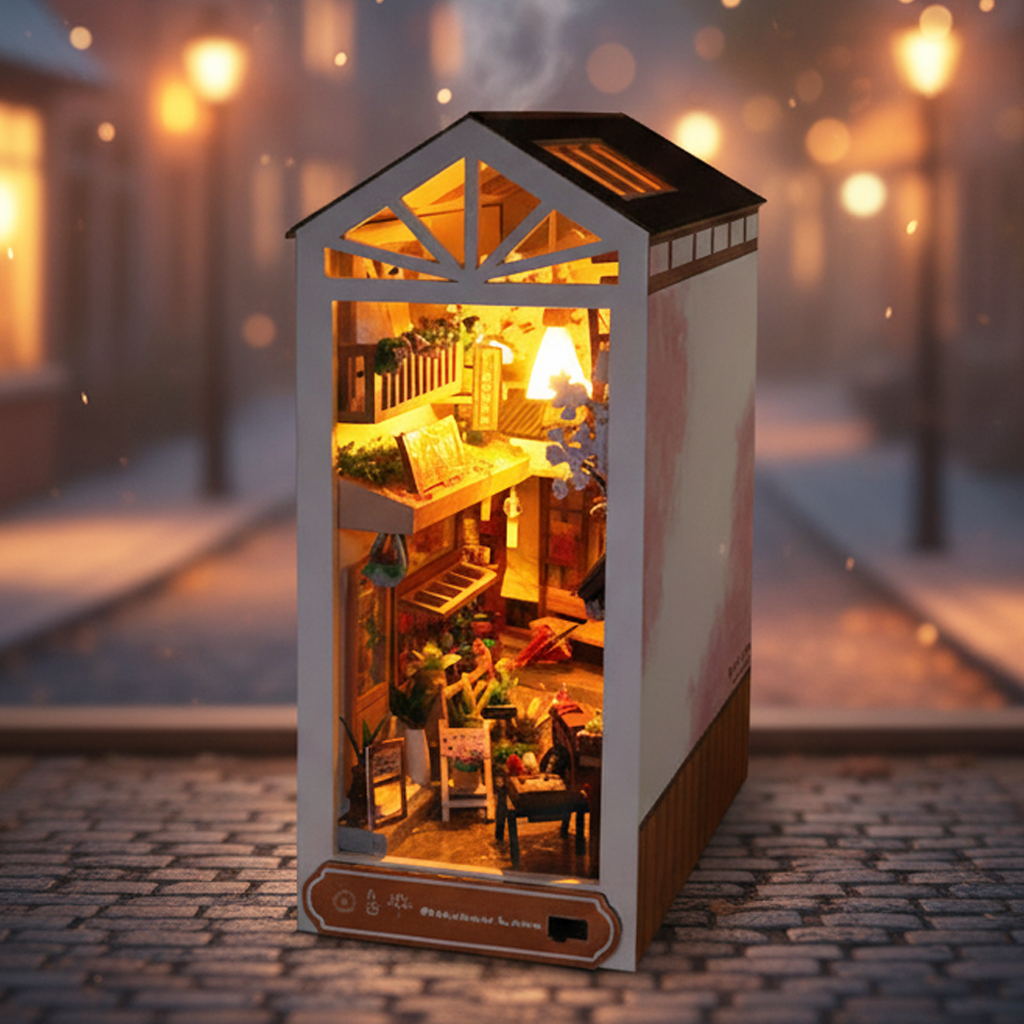 Take a stroll down the serene and picturesque Rainbow Lane, a miniature Japanese-style shopping street filled with charming details. This DIY book nook kit features a quaint flower shop, a cozy grocery store, and a world of tranquility. Every corner of this vibrant scene invites you to pause and appreciate its beauty.
