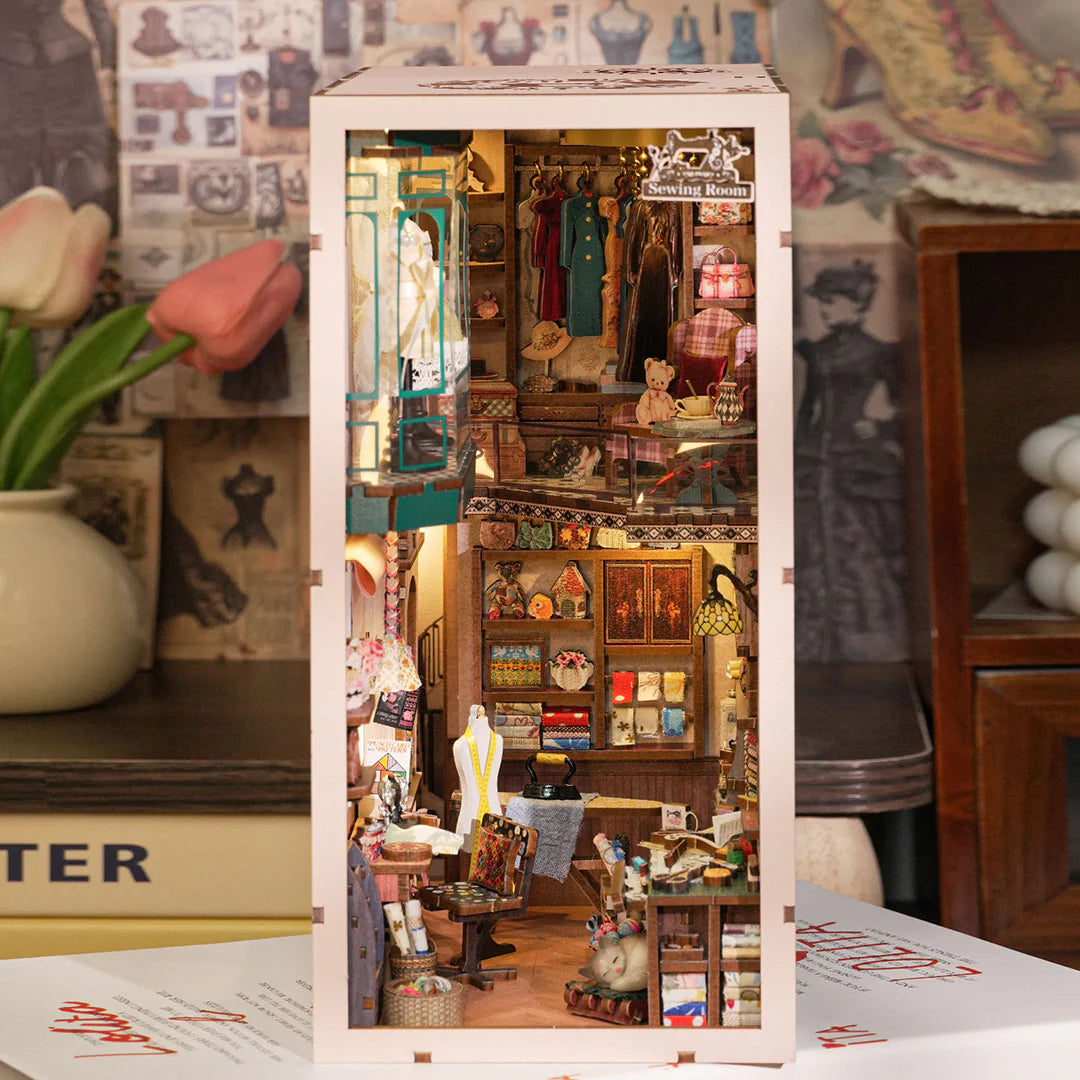 Inside this nook, every corner feels like a real sewing room shrunken down: a machine by the window, quilt blocks on the wall, fabric rolls stacked neatly, baskets full of scraps, and a second floor display with finished dresses. Warm LED lights make it look like someone has just stepped away for a cup of tea, leaving the project mid-stitch. The layered, two level layout draws the eye deeper into the scene so that every time you walk past your bookshelf, you notice another little detail, from the ironing station to the cutting table and tiny books tucked on the shelves.