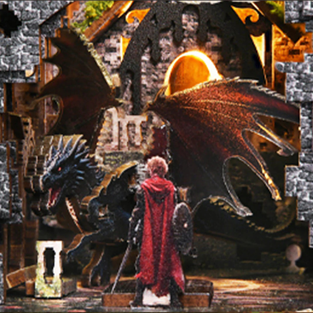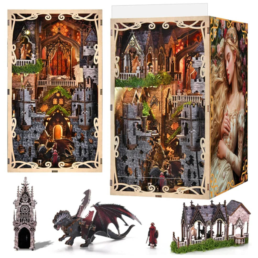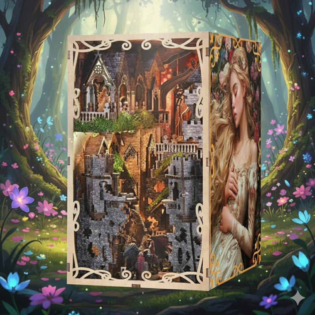 Layer by layer, spire by spire, the castle and throne room take form. Ivy creeps over stone, silhouettes hover behind stained glass, and the dragon’s shadow lurks while the princess dreams. Each part feels steeped in hush, waiting for the spark that ends the silence.