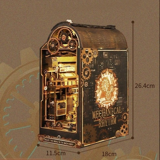 Once the wiring and LED are in place, warm light seeps through grate covers, accentuates polished metal textures, and casts shadowy details across the model. Your completed book nook doesn’t just sit—it pulses with quiet, mechanical life.
