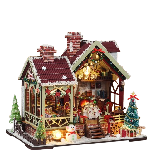Piece by piece, the lodge takes shape: frosted windows, garlanded beams, a Christmas tree laden with gifts, and a snowman waiting by the door. Each detail whispers of late December nights, warm laughter, and candlelit stories—drawing you into a world where cold is kept outside and the heart glows within.