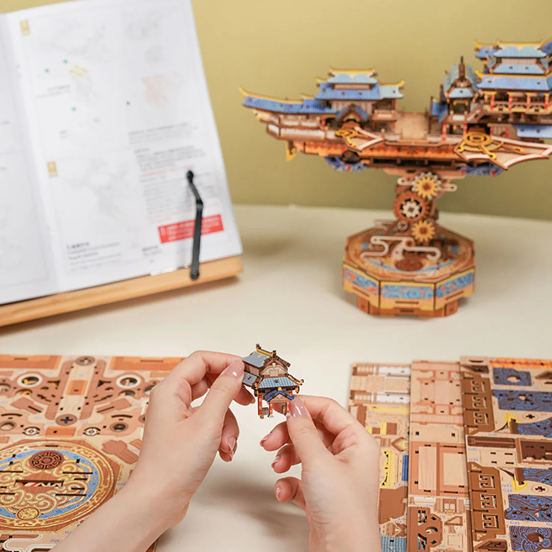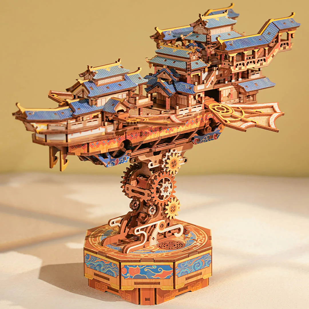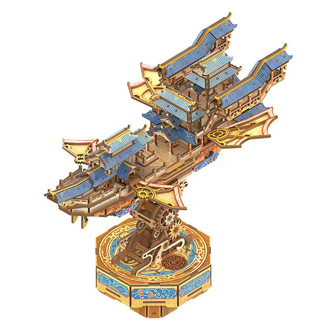 The "Wind Voyager" 3D Wooden Puzzle takes you on a majestic journey through the clouds with a beautifully designed spaceship. This intricate model captures the essence of a flying barge, complete with Oriental architectural elements and a captivating mechanical structure.